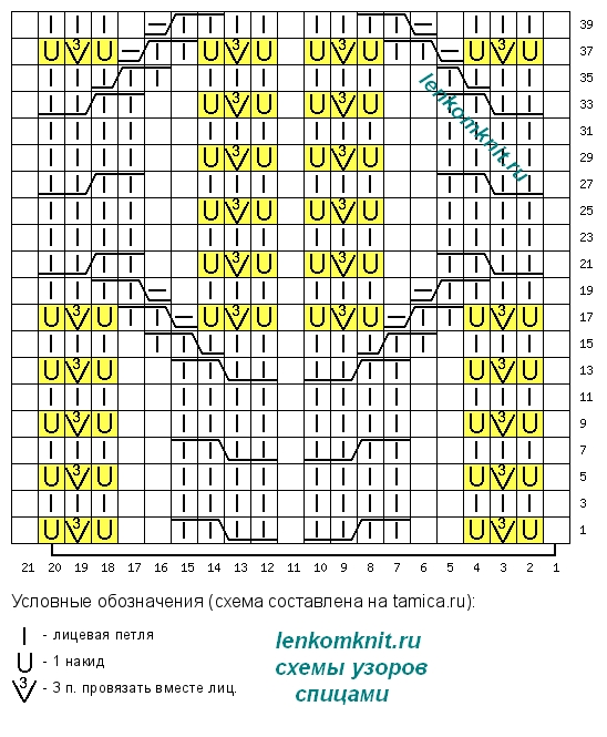 Раппорт узора составляет 20 петель (плюс 1 для симметрии) в ширину и 40 рядов в высоту.