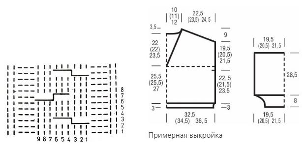 ПЛОТНОСТЬ ВЯЗАНИЯ: 23 п. х 30 р. = 10 см, связано узором из «кос» на спицах №5; 19 п. = 10 см, связано жемчужным узором на спицах №5.