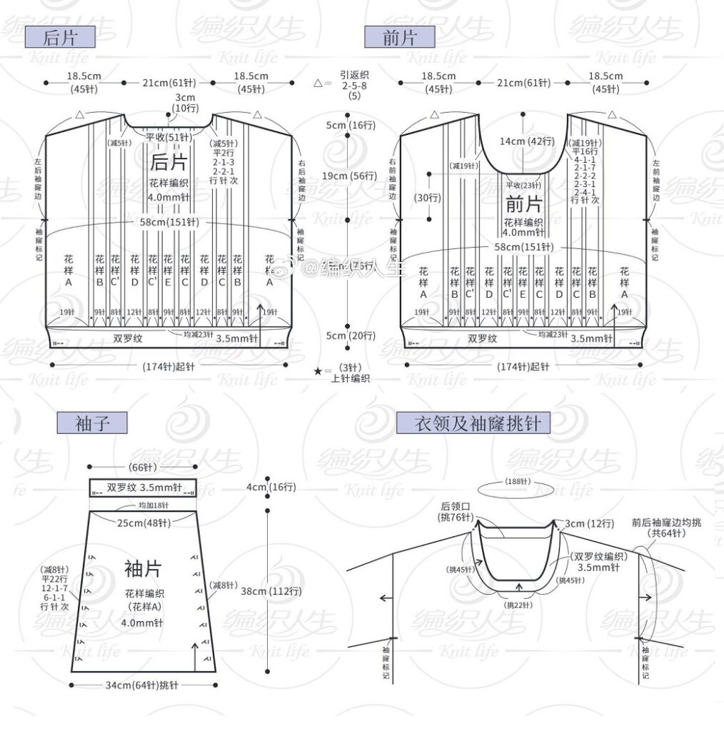 Далее вязать жемчужным узором до последней петли, выполнить 1 прибавку, 1 изн. Прибавленные петли вязать жемчужным узором. Эти прибавки повторять каждые 2,5 (2,5) 2,5 (2) 2 (2) см еще 11 (12) 13 (15) 16 (18) раз = 68 (72) 76 (80) 84 (88) п. Когда длина работы составит 39 (40) 41 (42) 42 (43) см, связать следующий круг.р. до последних 3 п., затем закрыть следующие 6 п. и одновременно снять маркер. Продолжить вязание рядами в прямом и обратном направлении. В каждом 2-м р. с обеих сторон закрыть 5 (5) 6 (6) 7 (7) раз по 2 п., 1 раз 3 п. и 1 раз 4 п. В следующем ряду закрыть оставшиеся петли. Второй рукав выполнить так же. Разложить детали на горизонтальной поверхности изнаночной стороной, увлажнить и оставить до высыхания.
