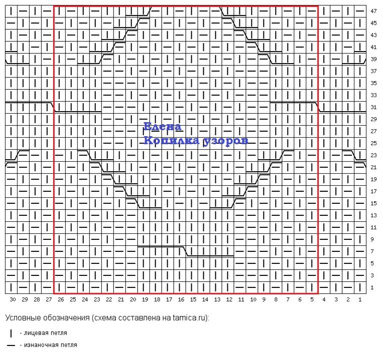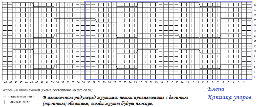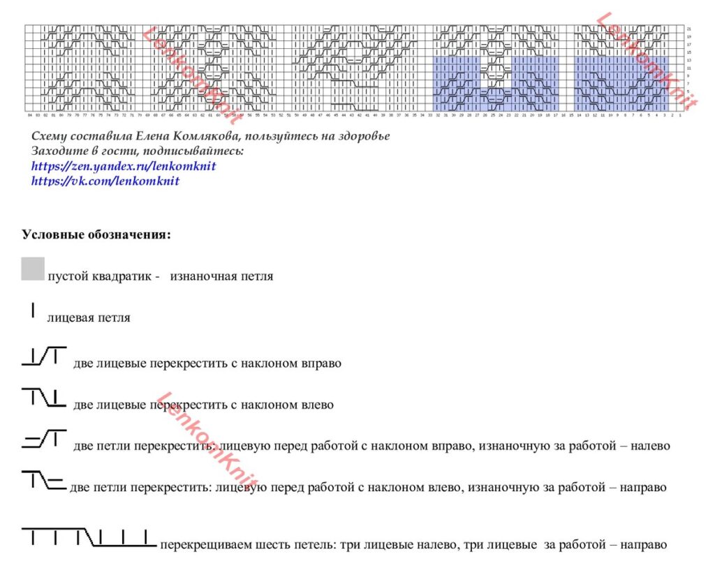 По бокам от центрального фрагмента схемы дублируется узор, расположенный на петлях с 17 по 32 справа и с 53 по 68 слева.