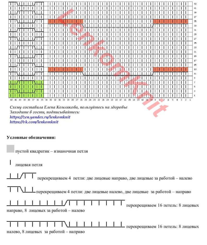На рисунке — схема узора. По центру вяжем в ширину пять раппортов узора в виде крупных сот (выделено зеленым цветом на схеме).