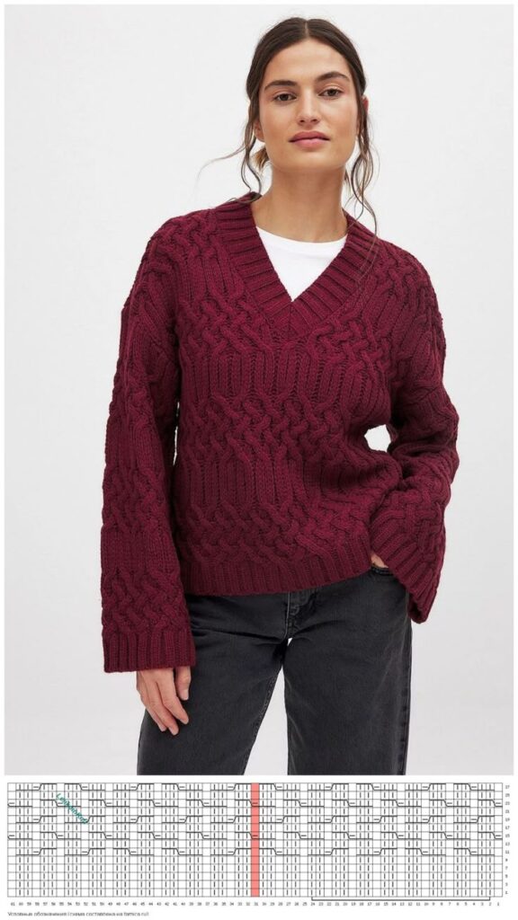 Глубокий бордо и сложный рельеф: V-образный вырез открывает дорогу графике из аранов. Классическая резинка и ажурная «плетёнка» сменяют друг друга блоками, образуя жёсткий, почти «архитектурный каркас». Глубокая насыщенная палитра лишь усиливает игру света и тени на этом фактурном полотне.
