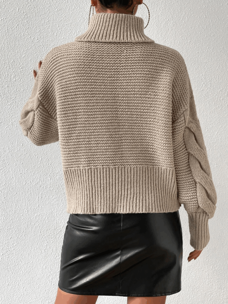 Уютный и актуальный: этот свитер с высоким воротником-гольф на эластичной резинке 1×1 выполнен в модном укороченном формате.