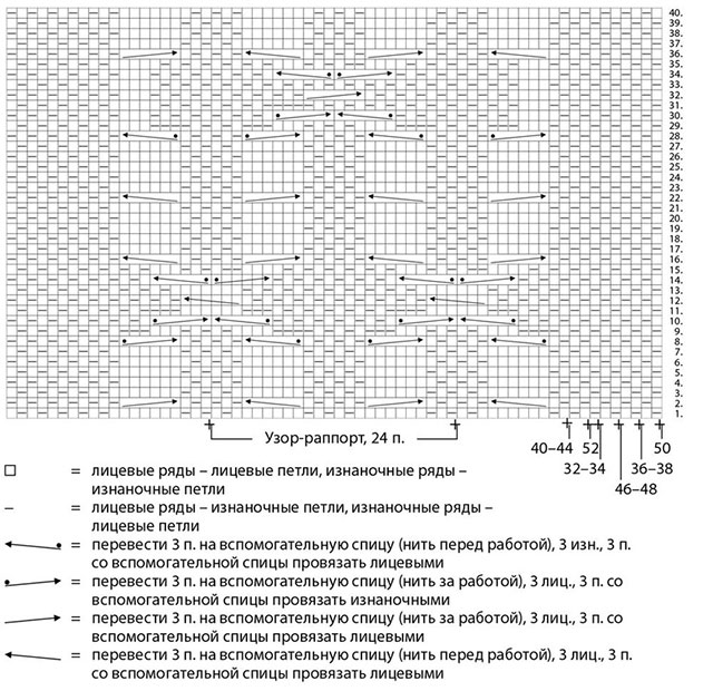 На круговые спицы №4 набрать 248 (264) 284 (304) 320 (340) п. Прикрепить маркер в начале круг.р. и еще один маркер в середине круг.р. через 124 (132) 142 (152) 160 (170) п. Связать 3 см наклонной резинкой по кругу. Перейти на круговые спицы №5 и продолжить вязание узором из «кос», начиная с 1-го круг.р. на схеме (размеры указаны стрелкой): * связать 14 (18) 11 (16) 20 (13) п. с правой стороны схемы, повторить 24 п. узора-раппорта 4 (4) 5 (5) 5 (6) раз, связать 14 (18) 11 (16) 20 (13) п. с левой стороны *. Повторять от * до *. Связать 2—40-й p. на схеме, а затем повторять 1—40-й p.