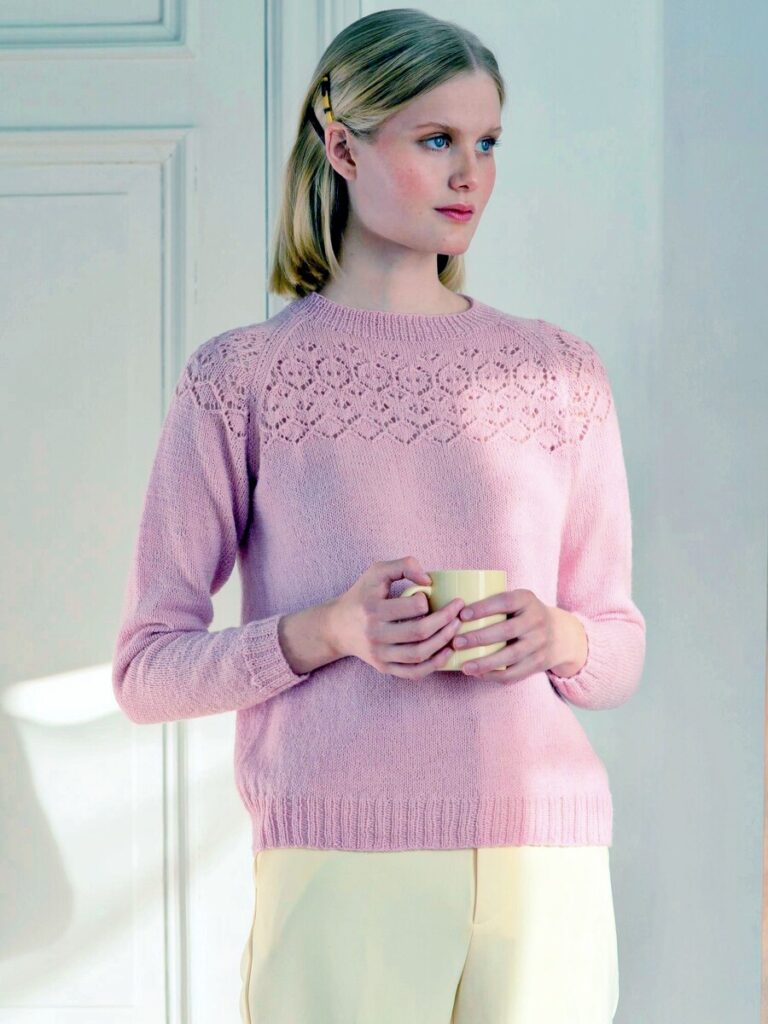 Пуловер реглан спицами с ажурным узором Читать далее »