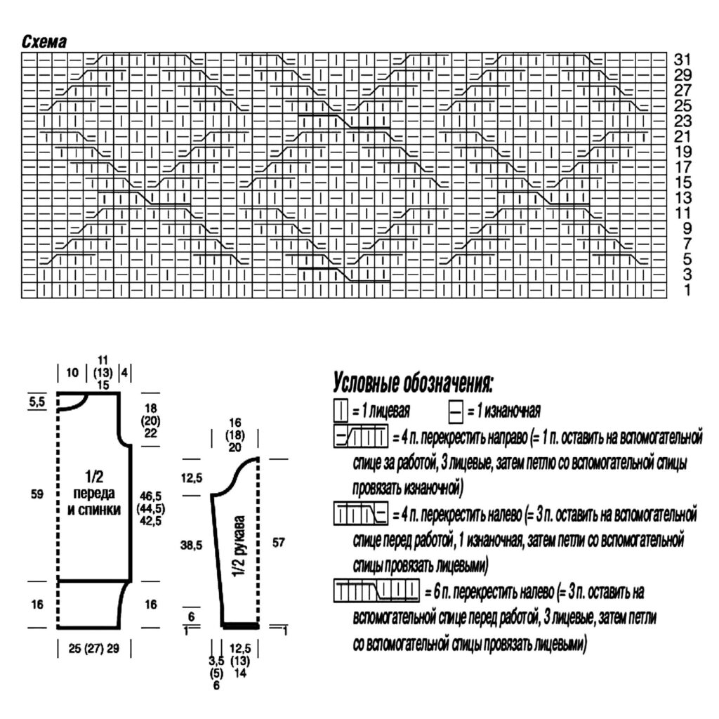 Плотность вязания: распределение петель — 23,5 п. х 27 р. = 10 х 10 см; узор 5 — 21 п. х 27 р. = 10 х 10 см.