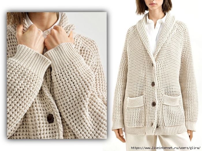 В этой статье разберу узор ажурного кардигана от Брунелло Кучинелли. Кардиган связан их пряжи с составом 76% хлопок и 24% полиамид.