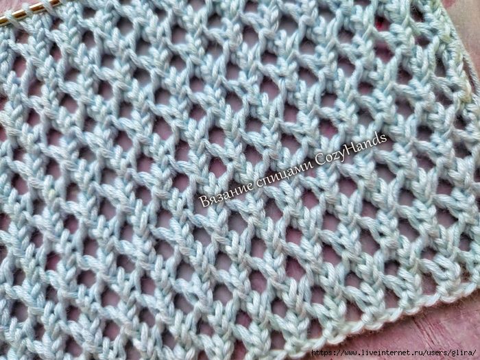 Узор не новый, но немного модифицированный. Пряжа использована объемная, судя по описанию изделия, это полиамидный шнурок набитый хлопковыми волокнами. Поэтому вязаное полотно выглядит менее ажурным. Благодаря переснятым петлям, сеточка еще больше сжимается, тем самым уменьшая дырочки.