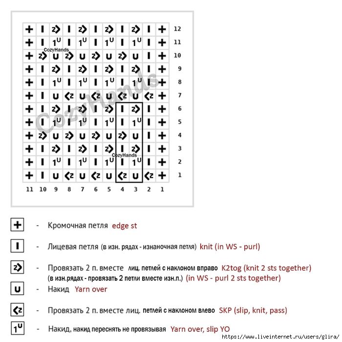 4 ряд: кром.п., * 2 петли провязать вместе 1 изн.п., 1 накид,* 1 изн.п., кром.п.
