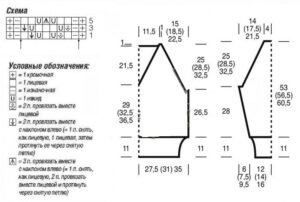 Через 28 см = 98 р. от планки закрыть с обеих сторон 1 х 6 п. и подчеркнуто убавить с обеих сторон для регланных скосов в каждом 4-м р. 20 (18) 17 х 1 п. и в каждом 2-м р. 3 (13) 22 х 1 п. Оставшиеся 17 п. закрыть через 53 см = 186 р. (56,5 см = 198 р.) 60,5см = 212 р. от планки.