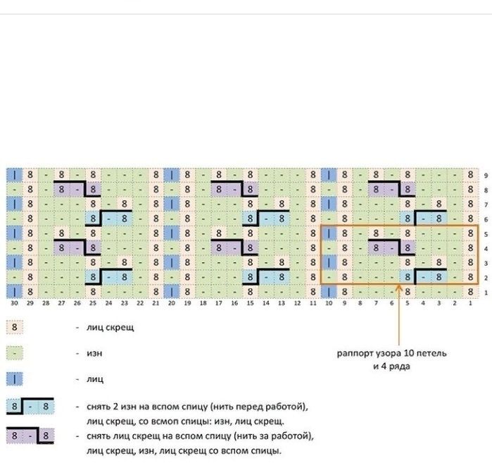 1-й ряд: <2 вместе лицевой скрещ с наклоном влево, 2 вместе изн, лиц скрещ, 2 вместе изн, 2 вместе лицевой скрещ с наклоном вправо, из>, повторять от < до > до конца ряда. ВИДЕО 3