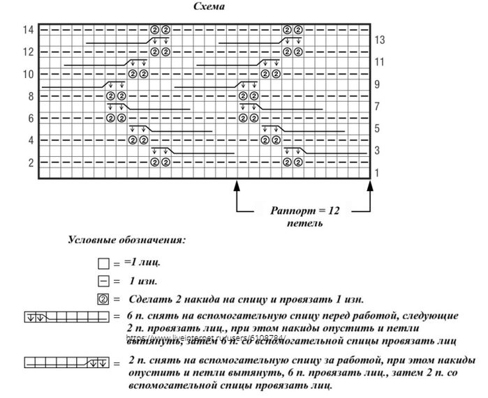 • Ажурный узор с косами: Количество петель кратно 12 + 6 + кромочные. См. схему для вязания. На схеме изображены лицевые и изнаночные ряды. Петли изображены так, как их вывязывают. 1-14 ряды провязать 1 раз, затем постоянно повторять 3-14 ряды.