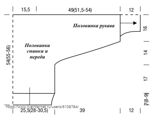 На общей высоте 24 (25 – 26) см для пройм с обеих сторон 1 раз прибавить по 1 п., затем в каждом 2-м ряду прибавить 1 раз по 2 п., 1 раз по 3 п., 13 раз по 6 п. и 1 раз по 12 п. (или набрать дополнительно) = 320 (332 – 344) п. Прибавленные петли постепенно включать в ажурный узор с косами.