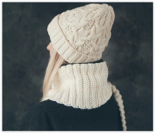 Зимняя объемная шапочка с отворотом, для нее подойдет тонкая шерсть в несколько сложений. Здесь используется пряжа в 5 сложений для резинки, и в 7 сложений – для основной части шапки. Данный мини мк подходит для размера 54. Для большего размера возьмите пряжу потолще, или спицы большей толщины, либо возьмите не 7, а 8 раппортов для основного узора с аранами.