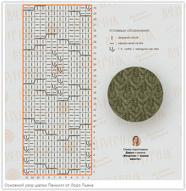 И так далее, вяжем 2 раппорта в высоту, далее, желательно примерить изделие на голову, и прикинуть, устраивает ли вас такая высота шапочки (будет еще 13 р. с убавками). Далее, начинаем убавку макушки, схема убавлений прилагается. У вас должна получиться аккуратная макушка.