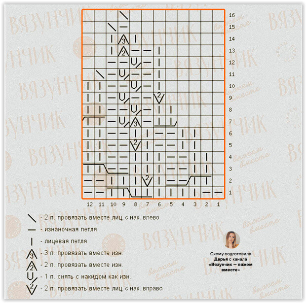 1-й р. убавлений: МК, *2 изн, 4 лиц, (ПКР) влево 2 лиц/2 лиц, 2 изн* – повтор 7 раз.