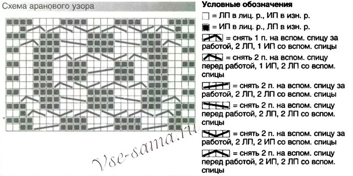 Арановый узор: вязать по схеме, на которой показан 1 раппорт в ширину и высоту. Узор показан с лиц. стороны.
