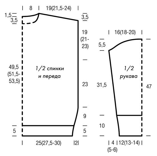 Перед: набрать 166 (182) 198 п. и связать для планки 5 см = 23 р. резинкой, начиная в 1-м изн. ряду с 3 изн., затем провязывать попеременно 2 лиц., 2 изн., заканчивать 2 лиц., 3 изн., кром. В след. ряду провязать все петли по рисунку. Далее вязать резинкой с «косами», начиная с петель между двойными стрелками, прибавить 4 п., как обозначено, и провязать 4 п. резинкой между стрелками а и b, а также с и d 1 (3) 5 раз = 170 (186) 202 п. В начале между «косами» будет находиться 138 п. лиц. глади, начиная с 41-го р. число петель будет уменьшаться. Начиная с 9-го ряда от планки прибавить с обеих сторон в каждом 4-м р. 8 х 1 п., как обозначено = 186 (202) 218 п. Начиная с 41-го р. от планки выполнять прибавления и убавления резинки в петлях лиц. глади по схеме, при этом число петель остаётся одинаковым. Такие прибавления и убавления выполнить после 41-го р. ещё 47 раз в каждом 4-м р. (в конце останется ещё 42 п. лиц. глади), затем провязать над «косами» 2 х 2 п. вместе лиц., то есть убавить по 2 п., и петли «кос» продолжить вязать до плеча как дорожки из лиц. петель. Через 32 см = 142 р. от планки отметить с обеих сторон начало пройм. Через 17,5 (19,5) 21,5 см = 78 (88) 96 р. от начала пройм для круглого выреза горловины отложить средние 24 п. и вязать далее раздельно, закрывая по краям выреза в каждом 2-м р. 2 х 2 п. и 6 х 1 п. Одновременно с 4-м убавлением для выреза горловины для скосов плеч закрыть с обеих сторон 9 (10) 11 п., затем в каждом 2-м р. 4 х 9 (10) 11 п. и 3 х 8 (9) 10 п.
