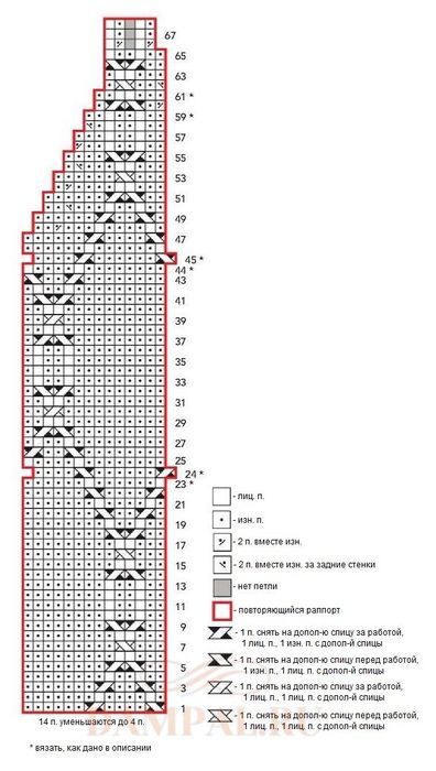 - Связать ряды 1-68 по схеме рисунка, провязывая маркированные ряды следующим образом: