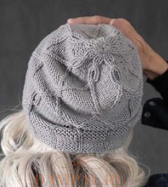 Женская шапка бини связана изнаночной гладью с сеткой жгутов.