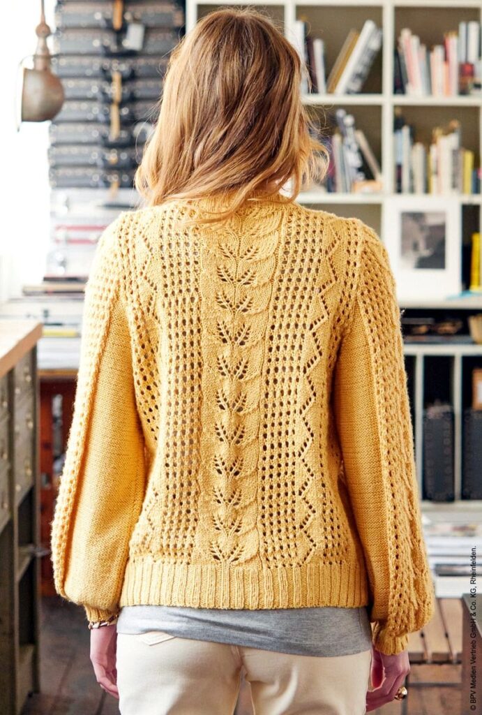 Для вязания нам потребуется 400 (450) 500 г золотисто-желтой пряжи FERNER WOLLE «Seide»: 50% шёлк, 50% шерсть; 130 м/50 г.